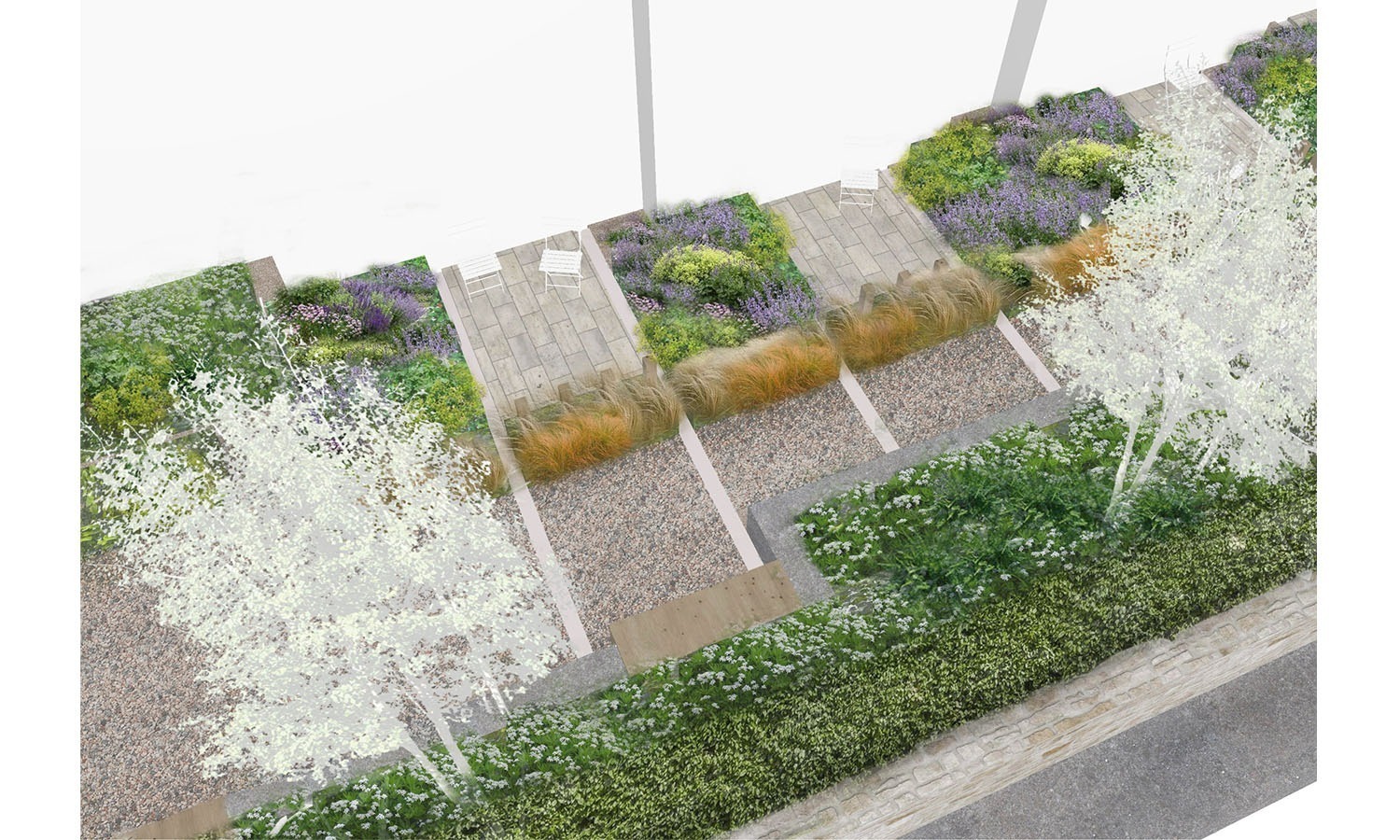 The planting was carefully considered to explore the relationship between the residents and the plants and to reference local landscapes and flora. The terraces that look onto the walkway can be defined with a planted buffer that creates some privacy, whilst avoiding a solid barrier. There is opportunity for wildlife enhancing elements such as bird feeders and insect habitats that are integrated into the landscape.