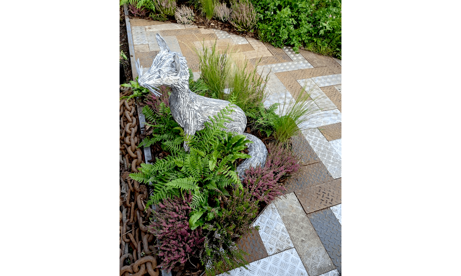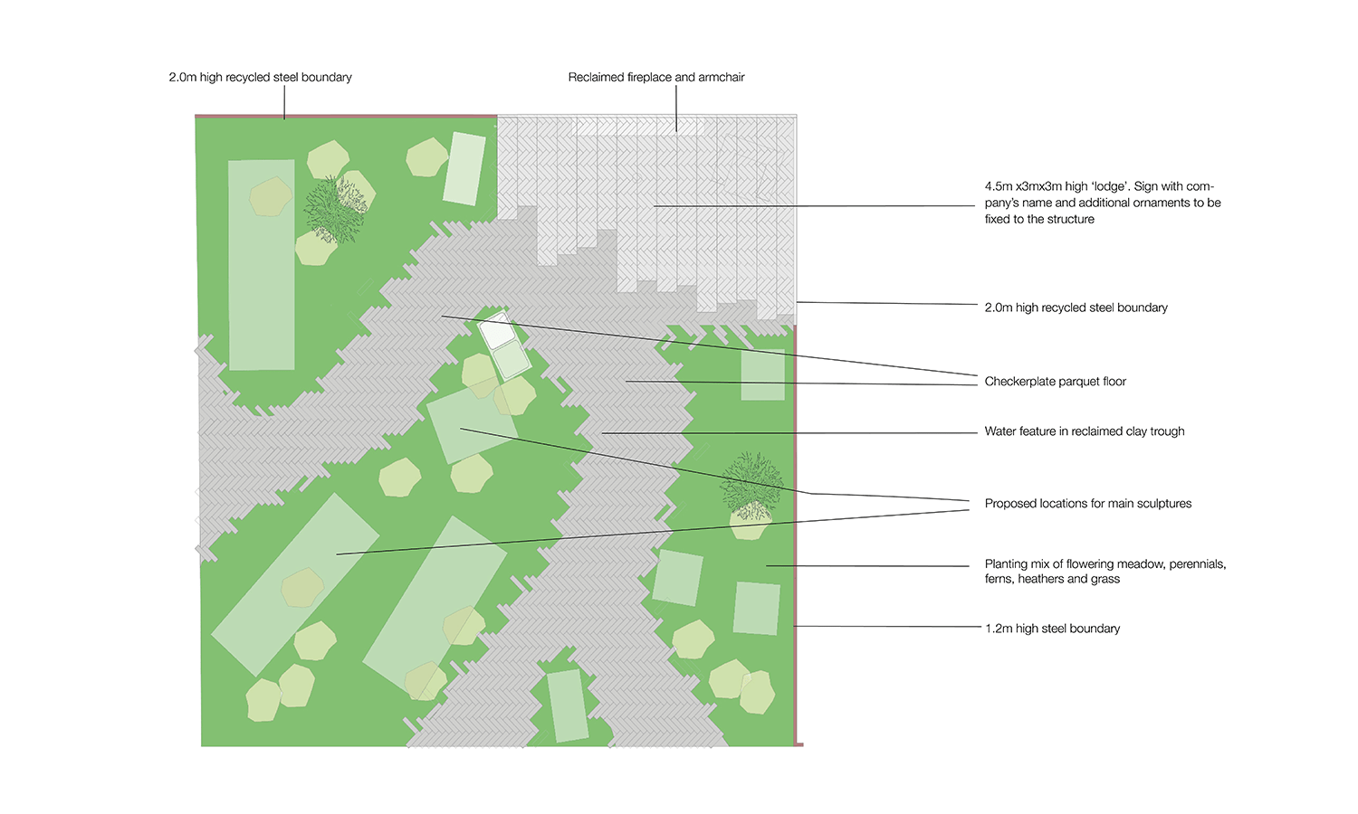 The design reflected Artfe’s fun and anarchic ethos, with elements such as the industrial take on parquet flooring and flattened oil drums to form the walls. Ferns and ivies reclaim the building, whilst wildflowers, heathers and grasses evoke the highland landscape in the garden beyond. A group of highland cows formed a key corner feature in the garden, whilst paths leading into the space from two sides allowed visitor flow and interaction with the intricate detail of the artworks.
