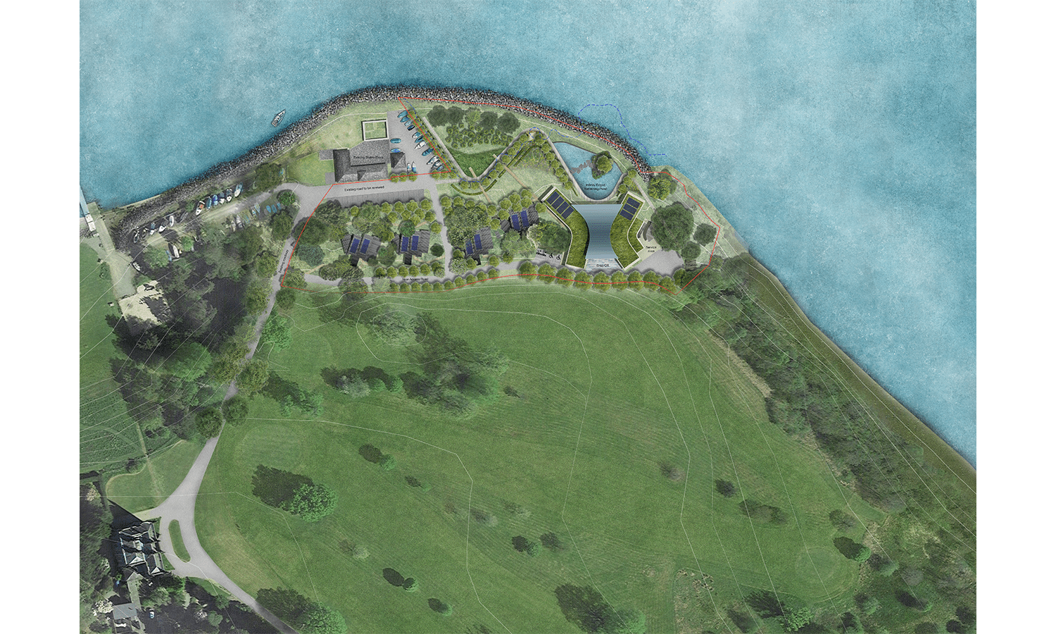 The proposed water feature with planted island was inspired by the Scottish landscape and is de-signed as infinity pool with naturally treated water. Meandering footpaths provide scenic routes through retained and newly created habitats of woodland, wildflower meadow, reed bed and native hedges.