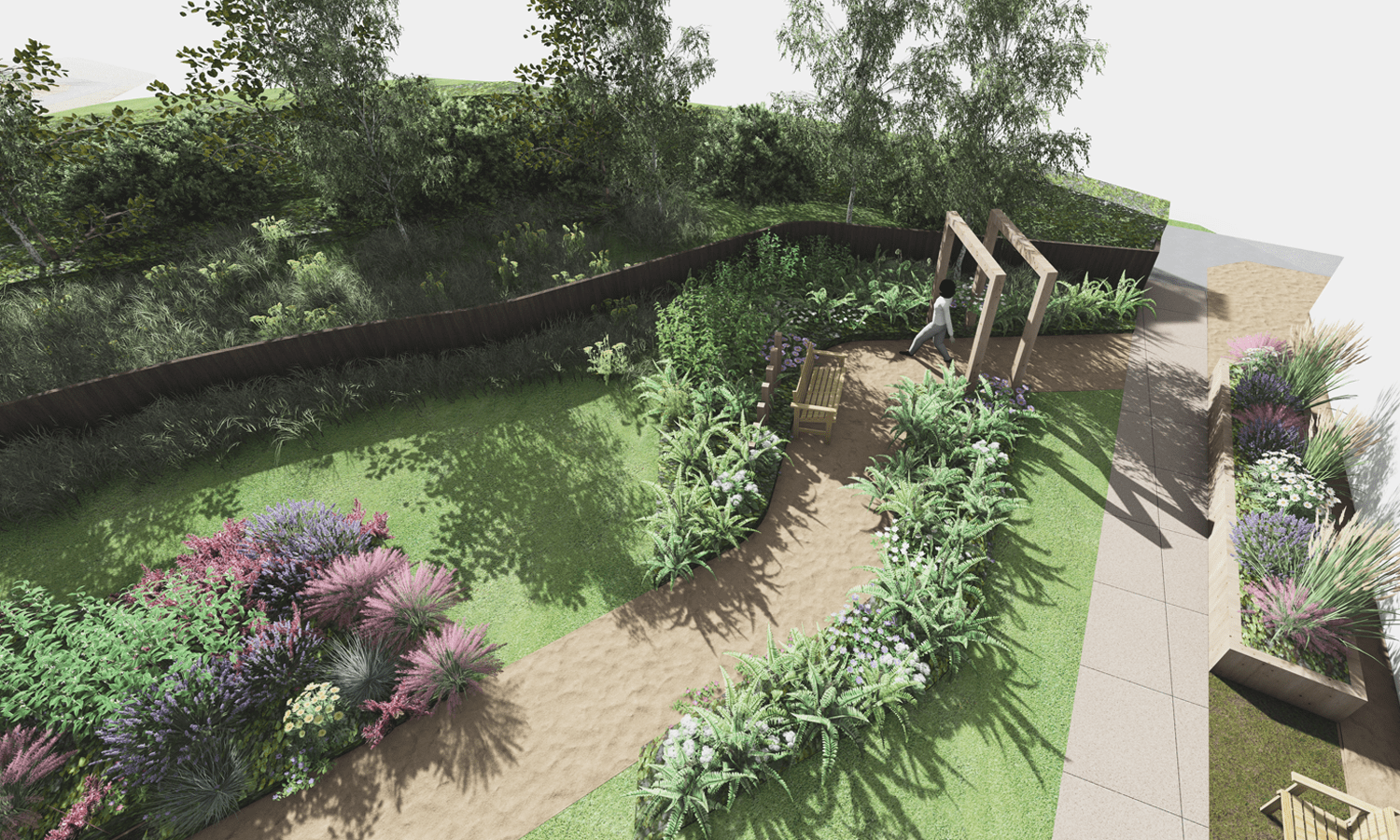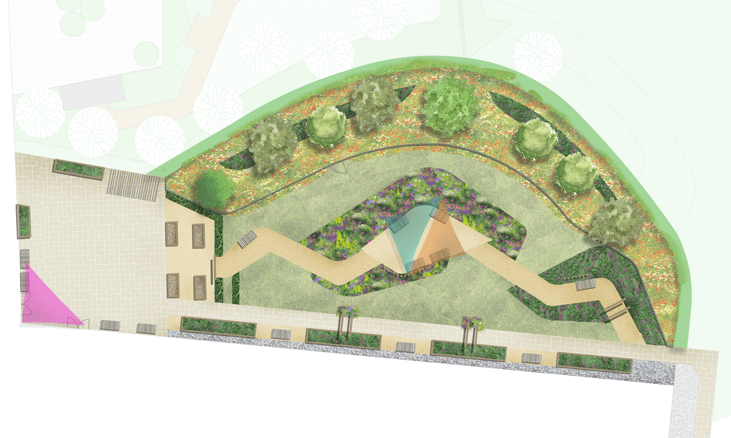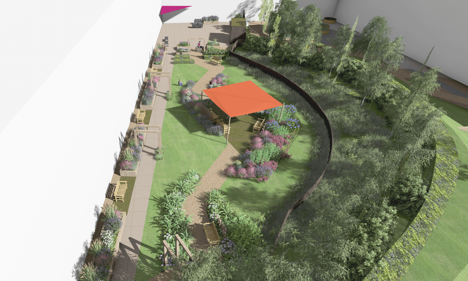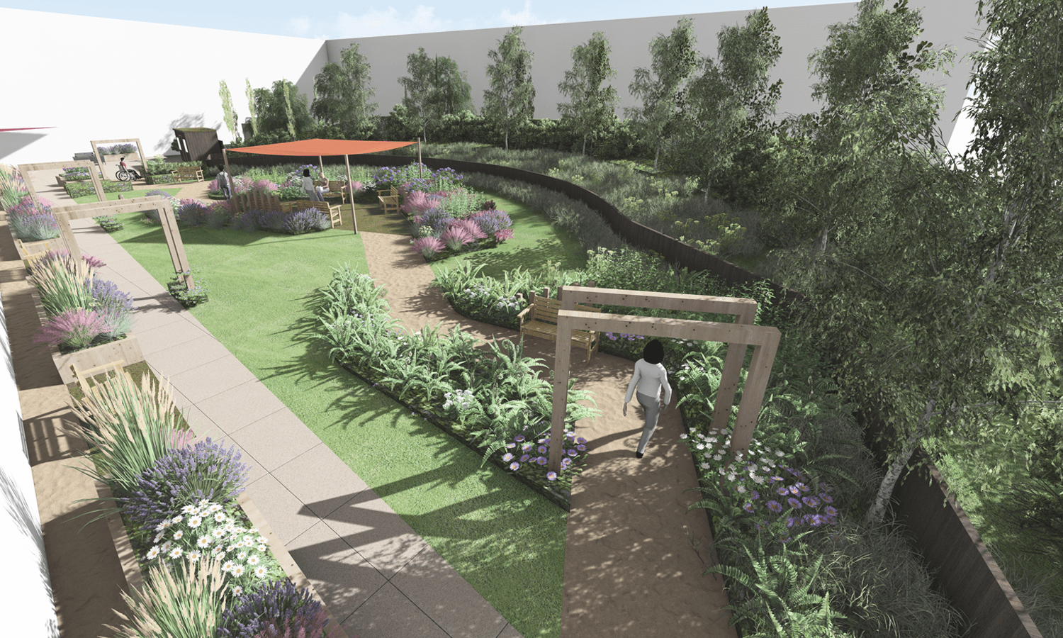 The space is currently of limited use therefore the focus of our design was to create variety of functional spaces along the circular route.  We introduced number of zones including growing area with raised planters, central seating zones with shade canopies and scented planting, woodland seating zone with woodland planting and series of raised planters with seats and sensory planting.