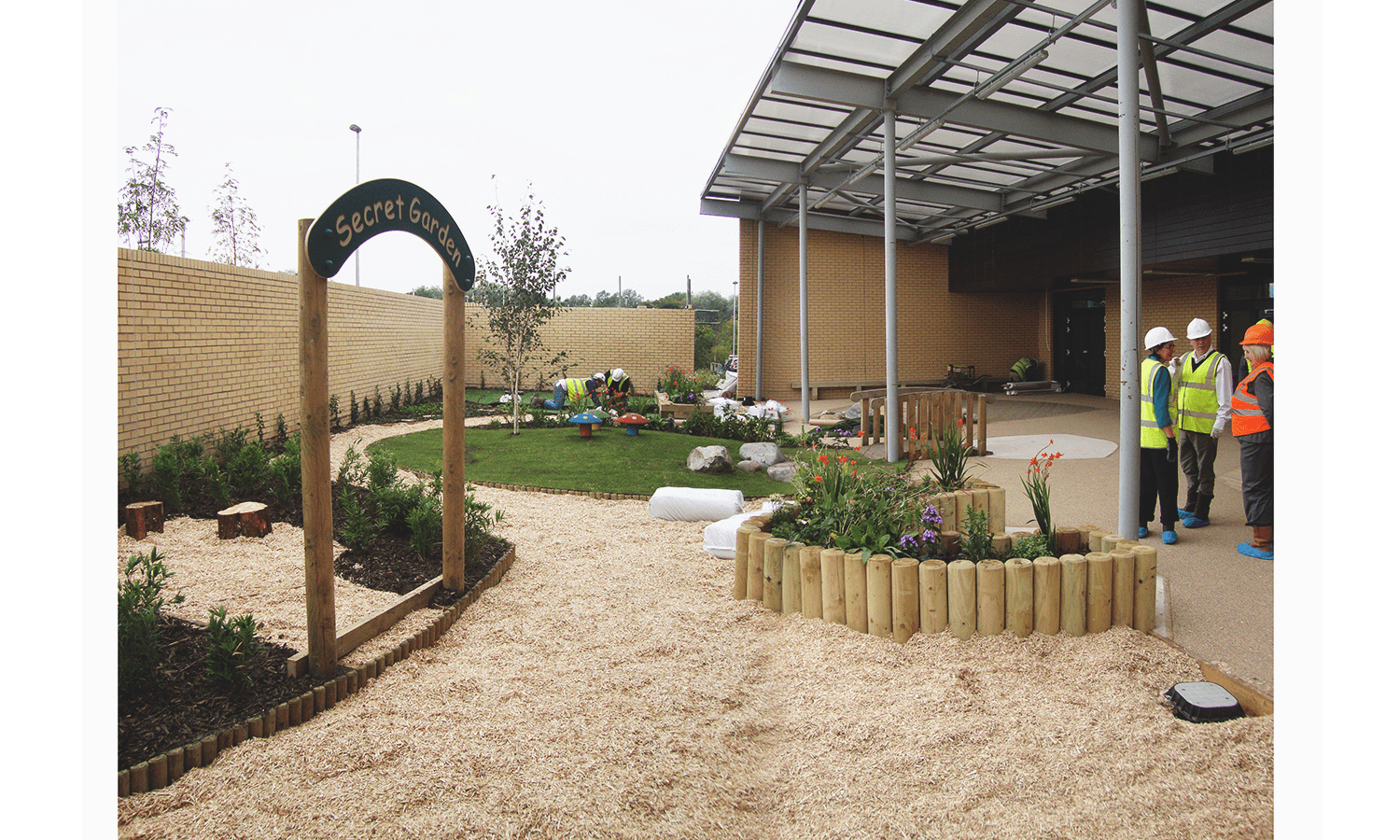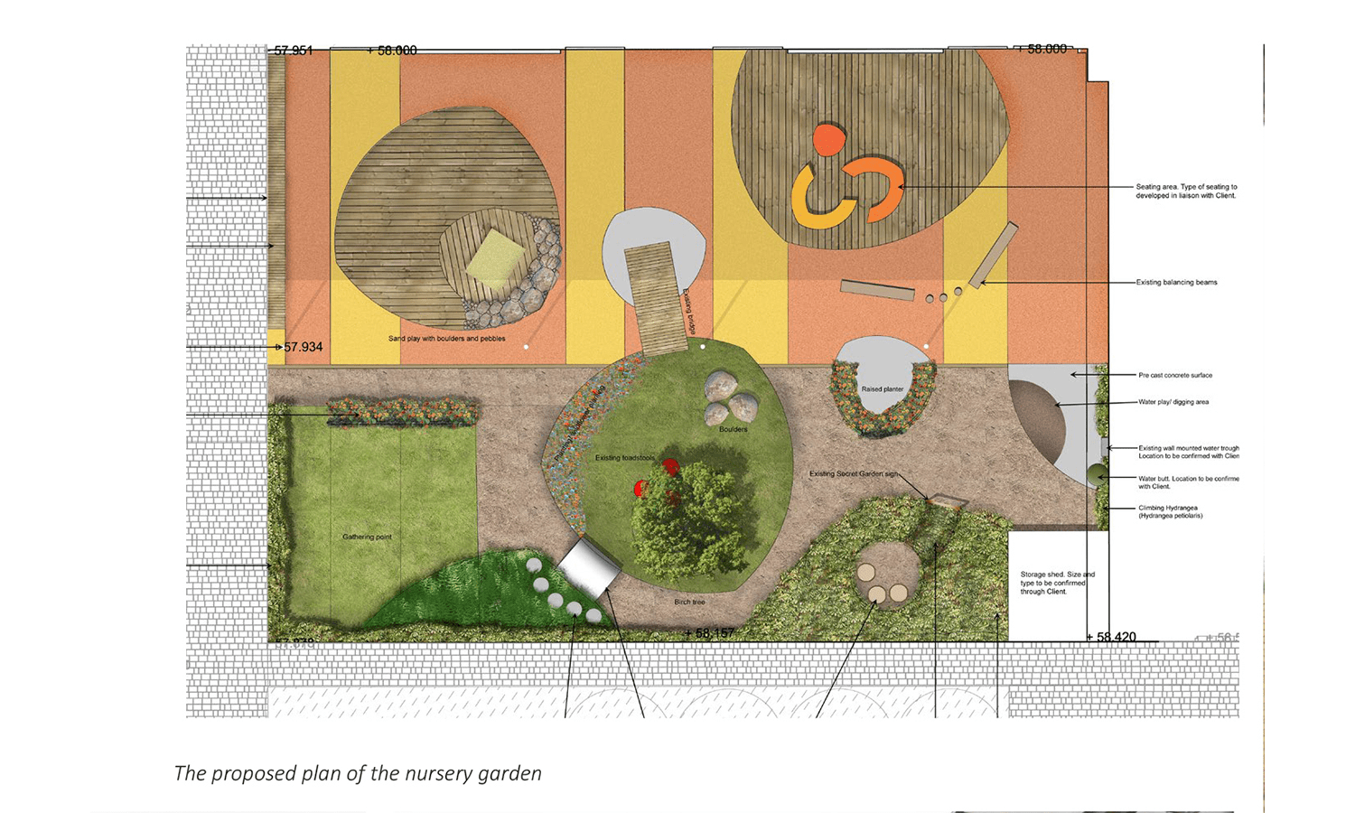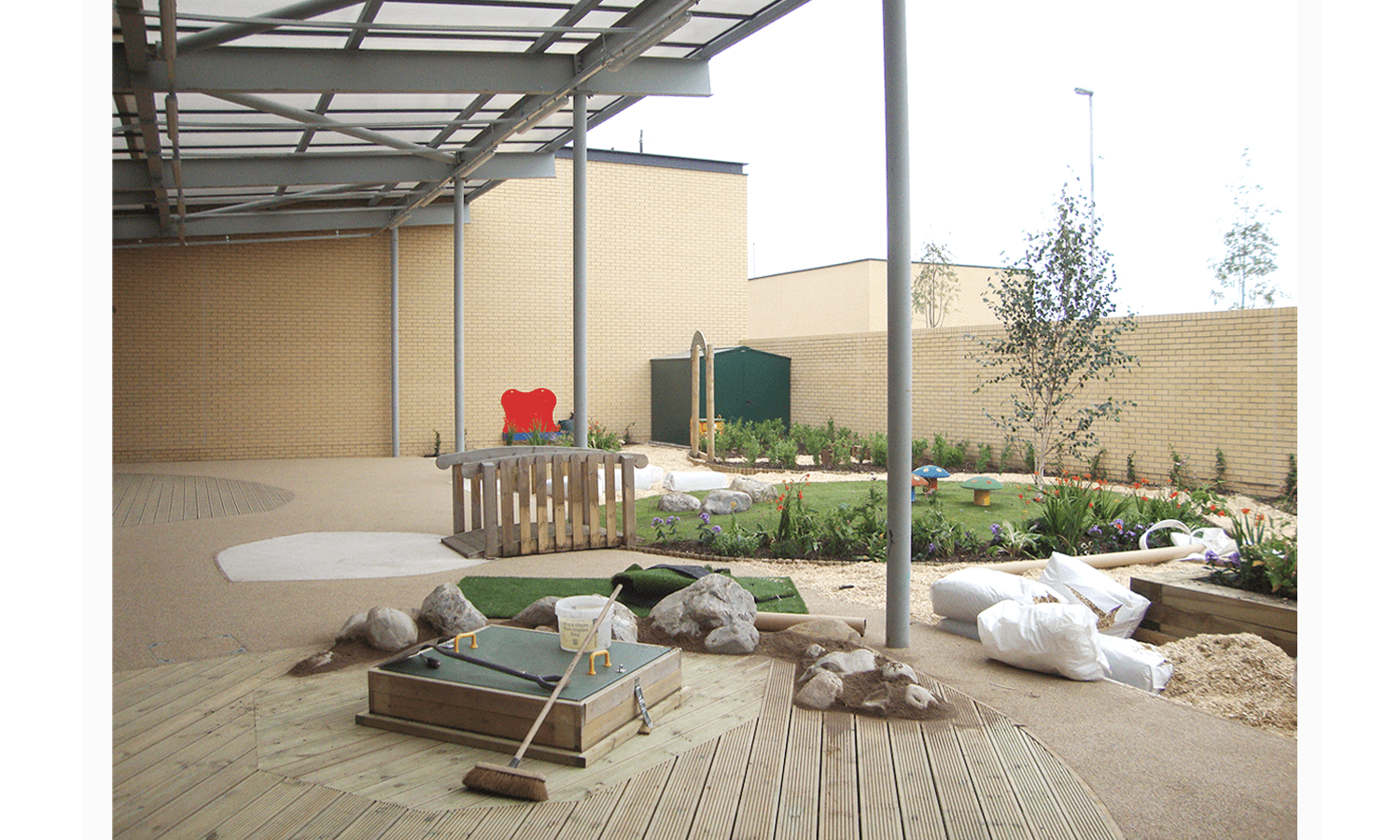 This nursery garden space had to accommodate existing equipment, and a varied and inviting play landscape. Elements such as the existing sand pit is incorporated into a decked surface, and bamboo planting created a secret garden area with seating inside. The concept for the space was that of play ‘islands’ with routes between and around them.
