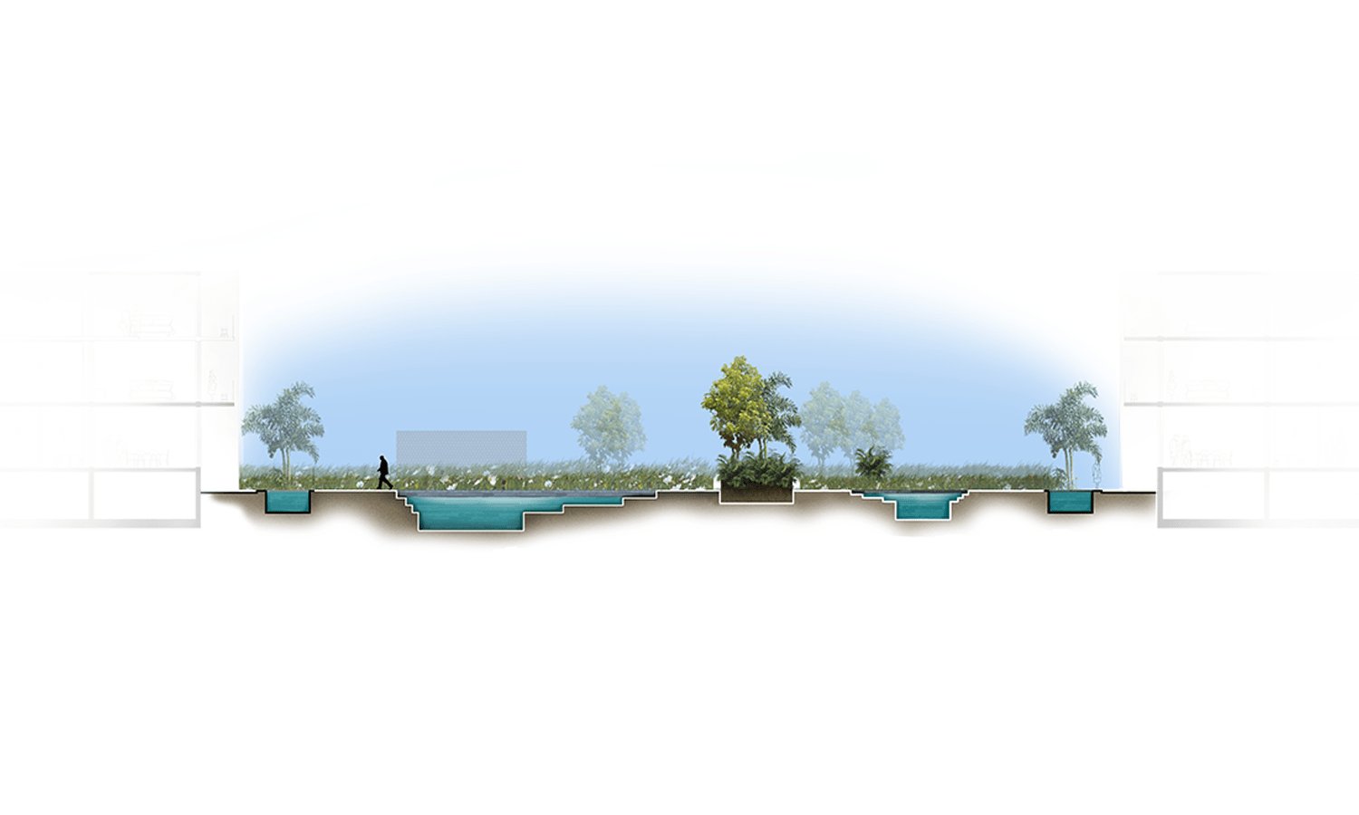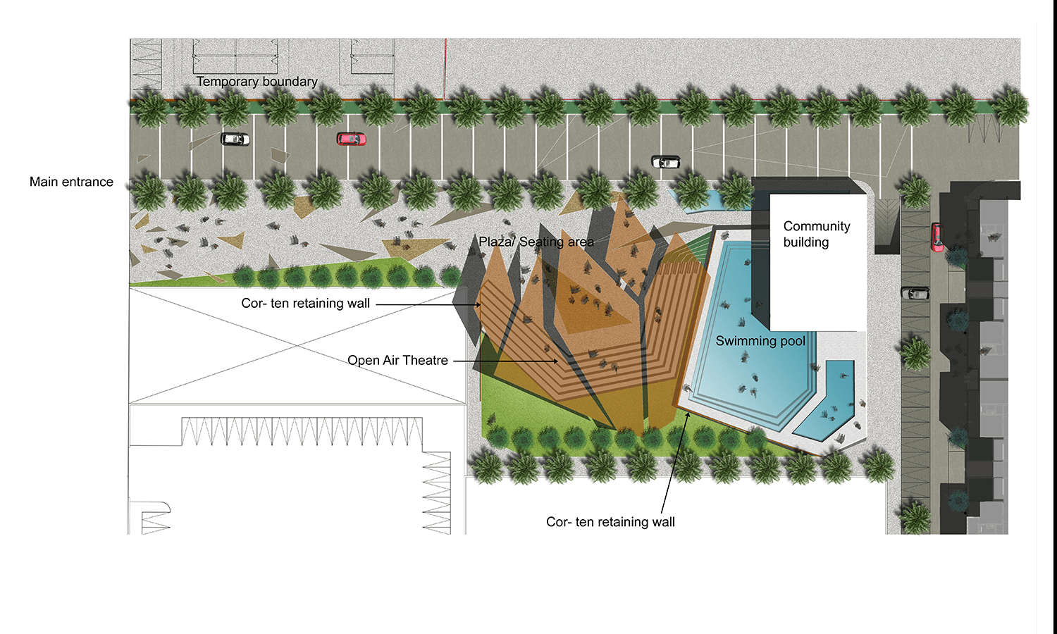 Following analysis of the built form and the spaces created we developed a concept based around the abstracted forms of plants to create a rich and varied series of spaces for residents. The landscape spaces comprised integrated children’s play, water features, landform and planting, all over a green roof structure that covered the underground car parking beneath.